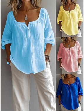 Mujer Camisa Blusa Lino de algodón sintético Frunce Color sólido Diario Elegante Casual Manga Larga Escote Cuadrado Tops regulares Diario Azul Piscina Amarillo Rosa Azul cielo Verano Primavera Otoño