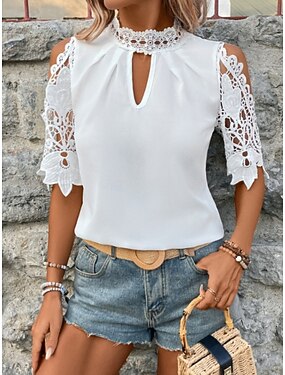 Mujer Camisa Blusa Tops de gasa Tops de encaje Ojal Plano Elegante Clásico Moderno Manga Corta Cuello Alto Tops regulares Diario Festivos Noche Blanco Verano Primavera