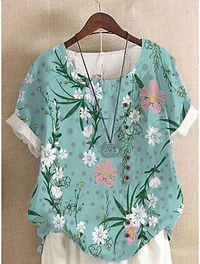 Mujer Camisa Blusa Lino de algodón sintético Estampado Floral Vintage Elegante Casual Manga Corta Cuello Barco Tops regulares Diario Verde Trébol Verano Primavera