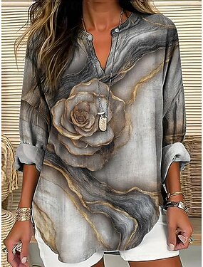 Mujer Camisa Botones Estampado Impresión de mármol Rosa Vintage Diario Casual Manga Larga Escote en Pico Tops regulares Diario Festivos Gris Primavera Otoño