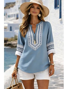 Mujer Blusa Estampado Floral Graphic Geométrico Bohemia Vintage Diario Manga 3/4 Cuello Barco Escote Barco Tops regulares Diario Festivos Ropa de vacaciones Verde salvia Verano Primavera