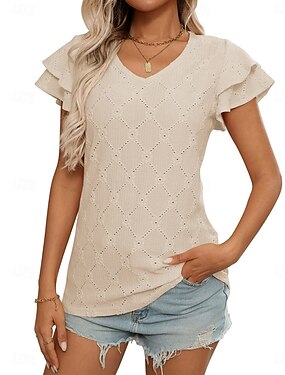 Mujer Blusa Volante Color sólido Elegante Casual Manga Corta Escote en Pico Tops largos Diario Azul Piscina Negro Blanco Rosa Morado Verano Primavera