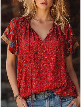 Mujer Blusa Estampado Floral Bohemia Vintage Casual Manga Corta Escote en Pico Tops regulares Diario Festivos Noche Azul Piscina Rojo Marrón Albaricoque Verano Primavera