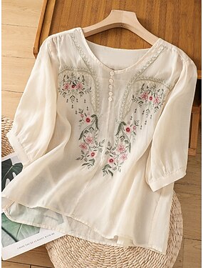 Blusa de lino parecido a algodón para mujer bordado floral casual 3/4 de manga cuello redondo tops regulares diario blanca azul marino verano primavera