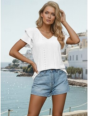 Mujer Blusa con textura Parte superior con ojales Camiseta de punto Blusa Retazos Botones Plano Vintage Elegante Manga Corta Escote en Pico Tops regulares Casual Diario Playa Rosa rubor Blanco