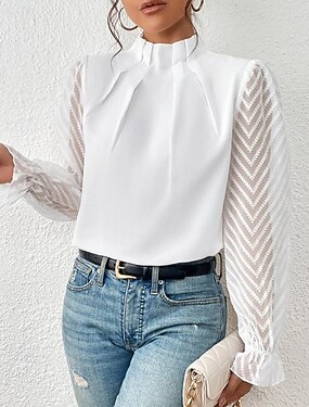 Mujer Blusa Encaje Color sólido Elegante Básico Casual Manga Larga Escote en Pico Tops regulares Diario Blanco Verano Primavera Otoño