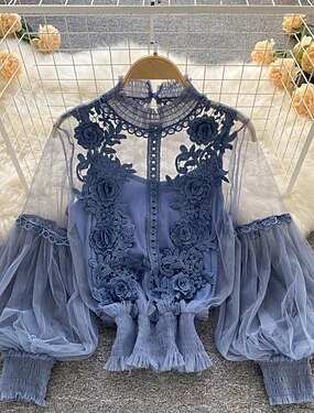 Mujer Blusa Parte superior con ojales Tops elegantes Ojal Sayo Diamantes Sintéticos Plano Elegante Vintage damas Manga Larga Cuello Barco Tops regulares Diario Trabajo Festivos Azul Piscina Negro