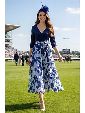 Corte A Vestido Midi Vestido de Fiesta Vestido Cóctel Vestido Invitada Boda Vestido de Madrina Manga 3/4 Escote en Pico Elegante Fiesta de jardin Boda Formal Satén con Estampado flor