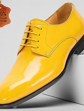 Zapatos derby de piel de primera calidad para hombre: piel de vacuno auténtica, acabado amarillo brillante, estilo clásico y elegante, zapatos de vestir cómodos para hombre, perfectos para la oficina, bodas y ocasiones especiales.