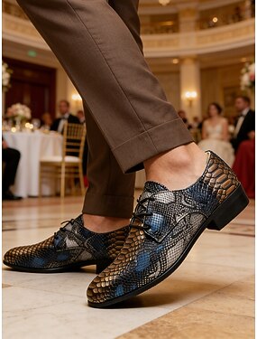 Zapatos de vestir de piel sintética con estampado de serpiente en azul y gris para hombre, modernos zapatos con cordones para discotecas, eventos de moda, atuendos atrevidos y bodas.