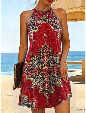 Mujer Vestido hasta la Rodilla Vestido de una línea Vestido de verano Vacaciones Casual Ajuste regular Graphic Damasco bohemio con estampado paisley Sin Mangas Cuello halter Rojo Morado Naranja Verde