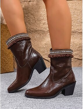 Botines vaqueros marrones de piel sintética para mujer: botas vaqueras de tacón cuadrado con ribete de flecos y puño con estampado étnico, elegante calzado de otoño.