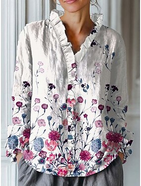 Mujer Blusa Frunce Volante Floral Graphic Elegante Vintage Diario Manga Larga Escote en Pico Tops regulares Diario Trabajo Festivos Blanco Rojo Verde Trébol Verano Primavera