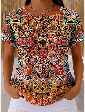 Mujer Camiseta Estampado Graphic Geométrico Cachemir Vintage Casual Manga Corta Escote en Pico Tops regulares Diario Fin de semana Ropa de vacaciones Amarillo Rojo Morado Verano Primavera