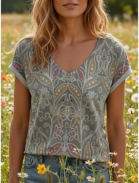 Mujer Camiseta Estampado Floral Graphic Bohemia Vintage Casual Manga Corta Escote en Pico Tops regulares Diario Gris Verano Primavera