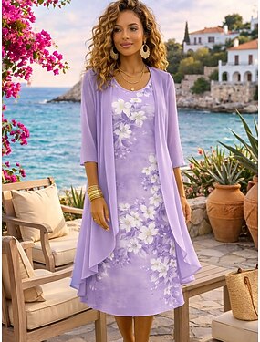 Mujer Conjunto de vestido Vestido de una línea Elegante Vacaciones Graphic Geometría Multi capa Estampado Vestido Midi Media Manga Cuello Barco Diario Azul Piscina Azul Real Morado Verano Primavera