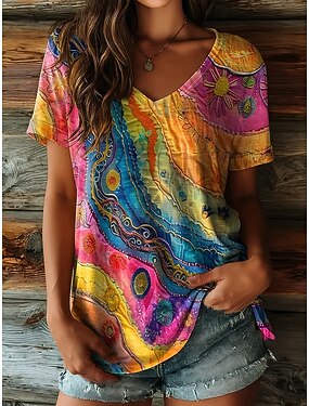 Mujer Camiseta Estampado Graphic Pintada Bohemia Vintage Casual Manga Corta Escote en Pico Tops regulares Diario Azul Piscina Verano Primavera