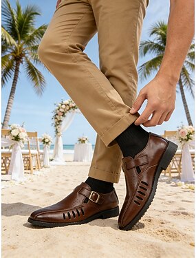 Sandalias marrones para hombre, parte superior perforada, cómodas, sin cordones, estilo relajado y elegante para bodas en la playa y eventos de destino.
