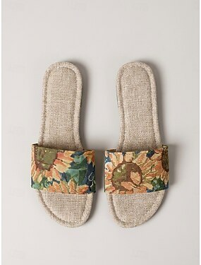 Sandalias planas vintage de tapiz floral para mujer - bailarinas bohemias de lino beige para vacaciones en islas y complejos turísticos de playa tropicales. &ropa informal para las vacaciones de