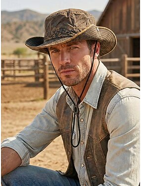 Sombrero de sol vaquero vintage para hombre, de poliéster multicolor, para exteriores, con ala plegable y correa para la barbilla, ideal para viajes de vacaciones, senderismo, pesca y uso diario