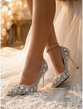 Zapatos de tacón de aguja con cristales dorados para mujer, zapatos de novia de lujo y glamour para bodas urbanas.