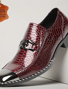Mocasines sin cordones para hombre en piel de vacuno auténtica color burdeos con estampado de serpiente y hebilla metálica: elegantes zapatos de fiesta y de noche.
