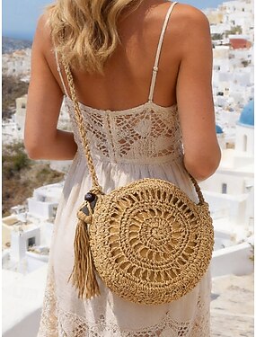 Bolso de hombro redondo de paja tejida estilo boho para mujer con borla, colores beige y caqui, bolso bandolera ligero de verano, perfecto para vacaciones, viajes y uso casual diario.