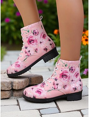Botines rosas con cordones y estampado floral para mujer: elegantes botas de combate de moda primaveral para looks casuales.