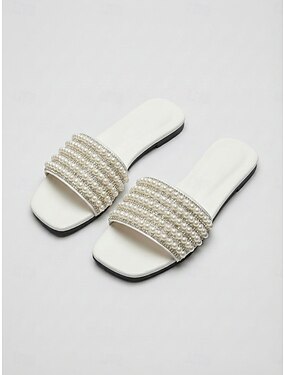 Sandalias planas adornadas para mujer, zapatos de vestir tipo chanclas con perlas y pedrería de punta abierta para cenas en resorts y vacaciones. &eventos de verano por la noche