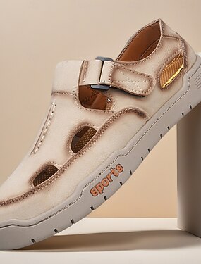 Sandalias deportivas beige para hombre con cierre de velcro, calzado veraniego de malla con puntera cerrada, estilo cómodo para exteriores, ideal para vacaciones en la playa, aventuras en la isla y paseos de ocio.