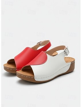 Sandalias de cuña bicolor rojas para mujer | Calzado cómodo con soporte para el arco del pie para caminar de forma informal, para usar todo el día y para las vacaciones de verano.
