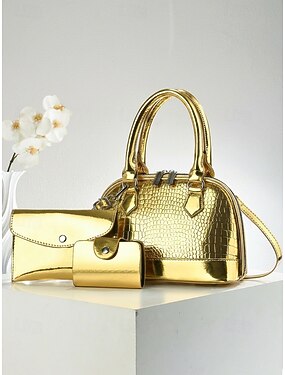 Conjunto de tres bolsos de mujer de piel sintética charol con relieve de cocodrilo, bolso bandolera multicolor con asa superior y correa ajustable, monedero y tarjetero para viajes y uso casual.