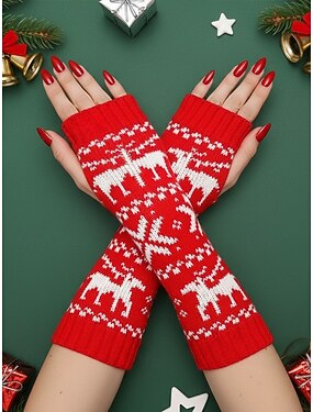 Guantes navideños de punto sin dedos para mujer, con estampado de renos Fair Isle en rojo y blanco. Guantes ideales para fiestas de invierno y eventos festivos.