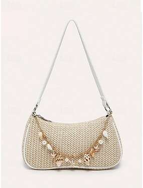 Bolso de mujer tejido de paja de poliéster con cadena de conchas, accesorio para vacaciones en la playa, ideal para uso diario.