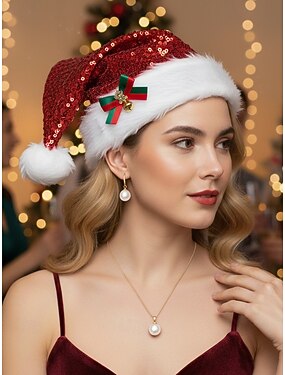 Gorro navideño de Papá Noel con lentejuelas para mujer, lazo festivo, campana y ribete de piel, accesorio para fiestas navideñas.