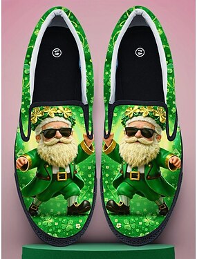 Zapatillas para hombre con temática del Día de San Patricio: diseño verde divertido con estampados de gnomos y calaveras, ideales para celebraciones del Día de San Patricio y ropa informal.