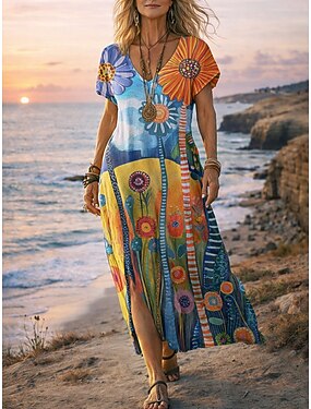 Mujer Vestido maxi Vestido bohemio Vestido informal Vestido de una línea Vestido Estampado Vintage Exterior Playa Vacaciones Ajuste regular Floral Graphic Manga Corta Escote en Pico Azul Piscina