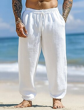 Hombre Pantalones de lino Pantalones Pantalones de verano Pantalones de playa Correa Bolsillo Cintura elástica Plano Comodidad Transpirable Vacaciones Diario Festivos Hawaiano Boho Blanco