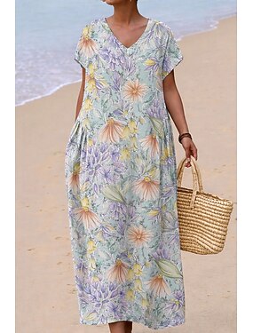 Mujer Vestido Midi Vestido bohemio Vestido de verano Vestido informal Vestido Étnico Elegante Bohemia Vacaciones Playa Festivos Cita Holgado Floral Graphic Manga Corta Escote en Pico Rosa Verde Trébol