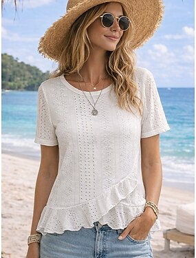 Mujer Blusa Bordado Color sólido Elegante Diario Casual Manga 3/4 Escote en Pico Tops regulares Diario Trabajo Festivos Blanco Verano Primavera Otoño
