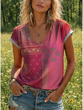 Mujer Camiseta Estampado Floral Graphic Pintada Bohemia Vintage Casual Manga Corta Escote en Pico Tops regulares Diario Rosa Verano Primavera