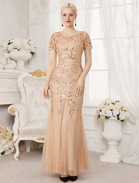Corte A Funda Columna Hasta el Suelo Bordado con cuentas Vestido Invitada Boda Vestido formal Vestido de Madrina Media Manga Escote en Pico Elegante Vintage Formal Gasa Encaje perlado con Plisado