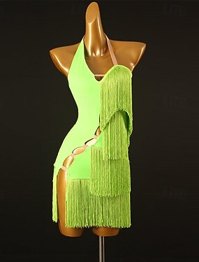 Vestido de baile latino con flecos verde neón para mujer, con cuello halter y abertura, ideal para rumba, salsa, cha-cha.