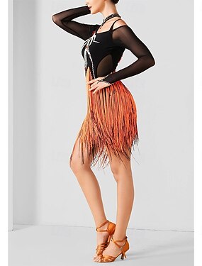 baile salsa vestido de baile latino borla con flecos junta dividida cristales/strass mujer entrenamiento de rendimiento manga larga malla chinlon