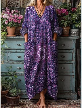 Mujer Vestido largo maxi Vestido bohemio Vestido informal Vestido Estampado Vintage Exterior Vacaciones Fin de semana Holgado Floral Graphic Manga Larga Escote en Pico Morado Verano Primavera Otoño