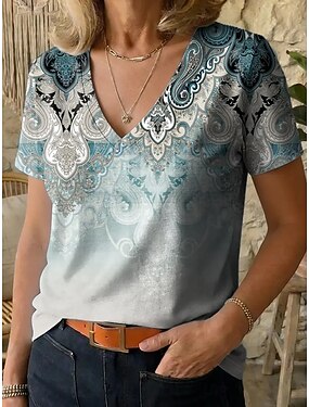 Mujer Camiseta Estampado Graphic Geometría Vintage Elegante Clásico Manga Corta Escote en Pico Tops regulares Casual Diario Noche Azul Piscina Morado Verde Trébol Verano Primavera