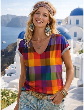 Mujer Camiseta Estampado Graphic Plaid Bohemia Vintage Casual Manga Corta Escote en Pico Tops regulares Diario Arco Iris Verano Primavera