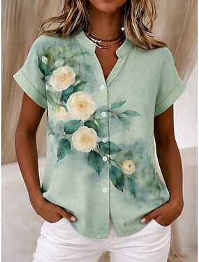 Mujer Blusa Lino de algodón sintético Botones Color sólido Elegante Casual Manga Corta Escote en Pico Tops regulares Diario Festivos Negro Blanco Marrón Verano