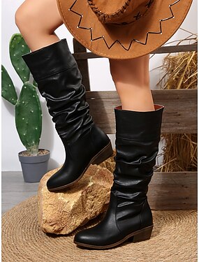 Botas altas hasta la rodilla de piel sintética marrón para mujer: botas holgadas con punta puntiaguda y tacón de bloque para otoño e invierno para un uso diario elegante y un estilo urbano informal.