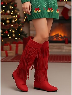 Botas altas rojas con flecos para mujer – estilo western festivo, ajuste suave y cómodo, perfectas para fiestas navideñas, salidas de invierno y disfraces de temporada.